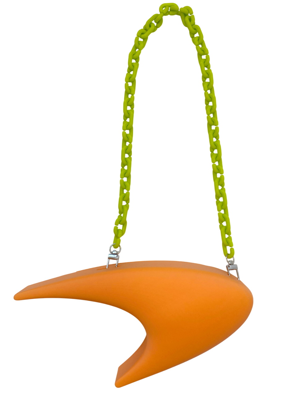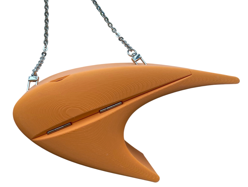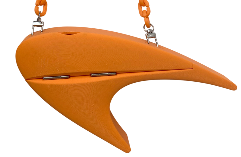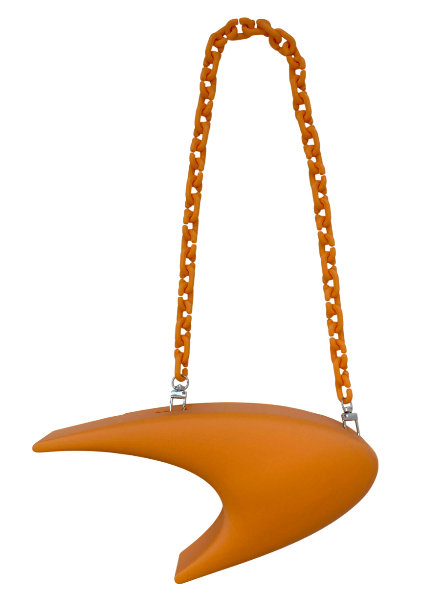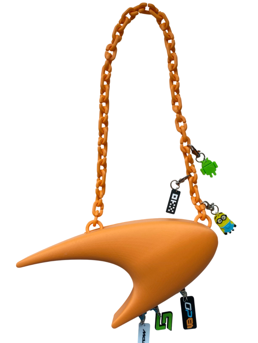 The Papaya Purse, conceptualized in March 2025, is based on the logo of McLaren for the first in a series of F1-inspired purses. The speedmark, as well as the McLaren Technology Center building, are sleek and futuristic in design. Similar design language can be found in the Nike and Star Trek logos. The purse captures this essence with its proportions and smooth 3D-printed surface. The purse body and strap were made in various "livery" colors. It was also made in two different sizes (the Papaya Mini and the larger Papaya purse).