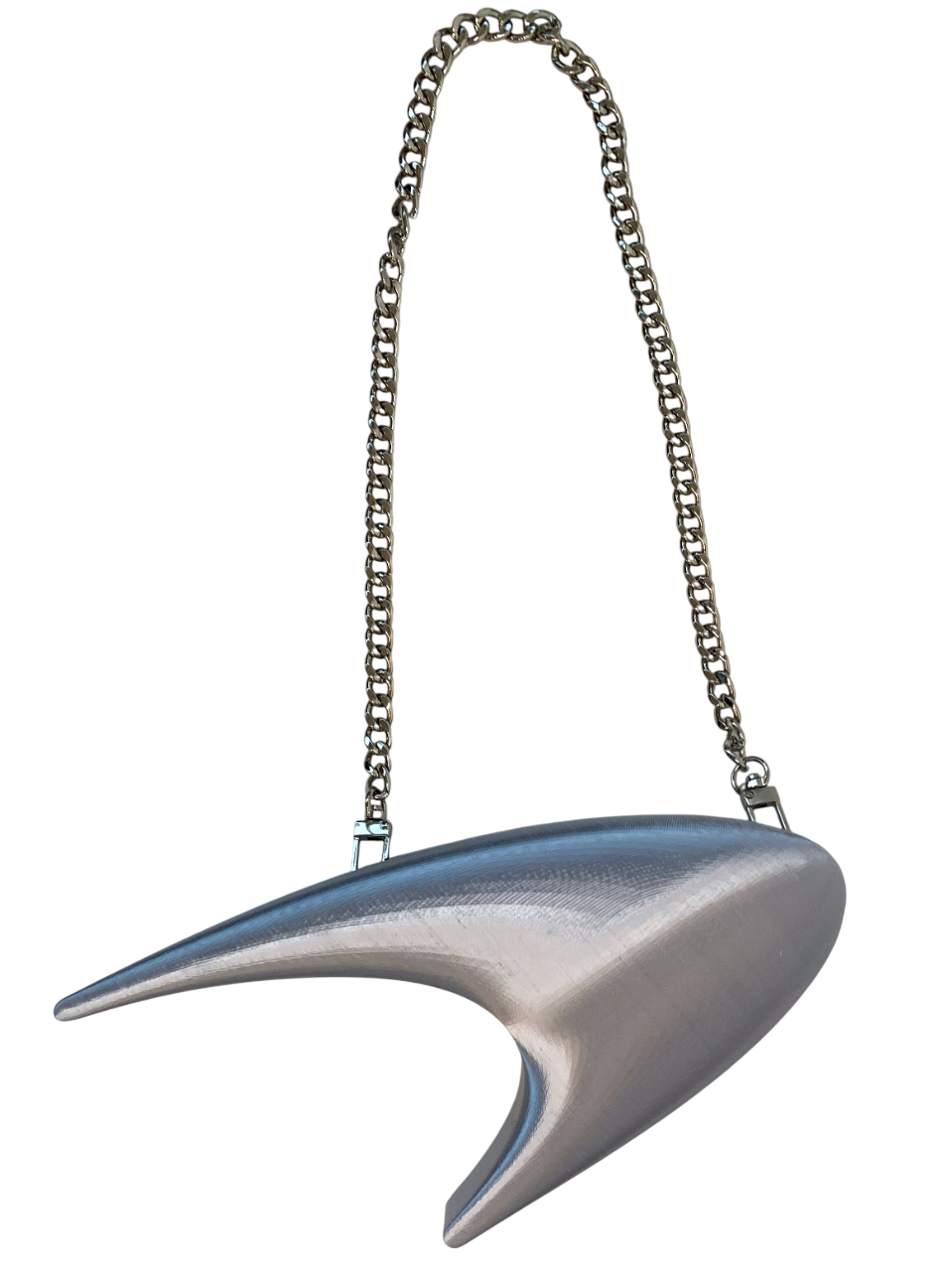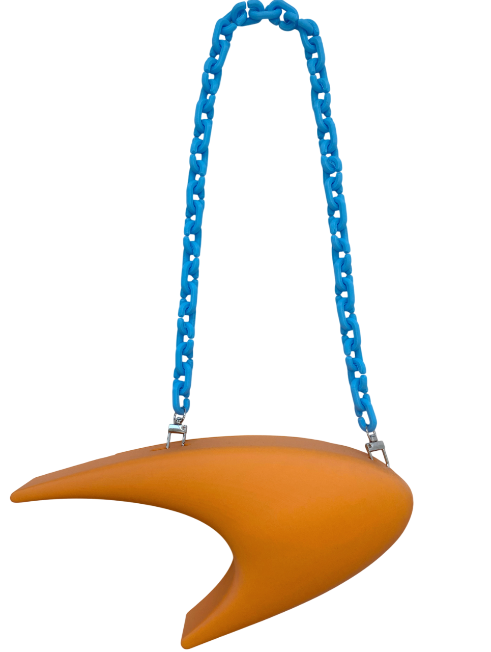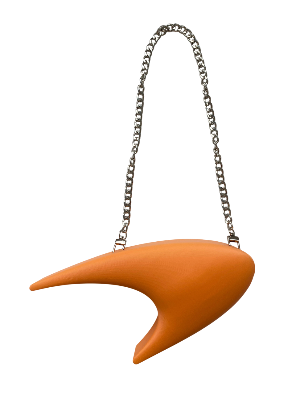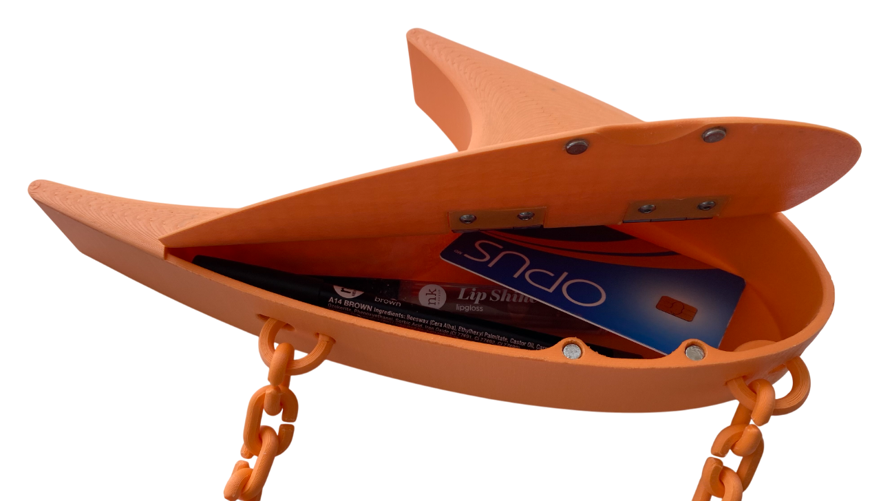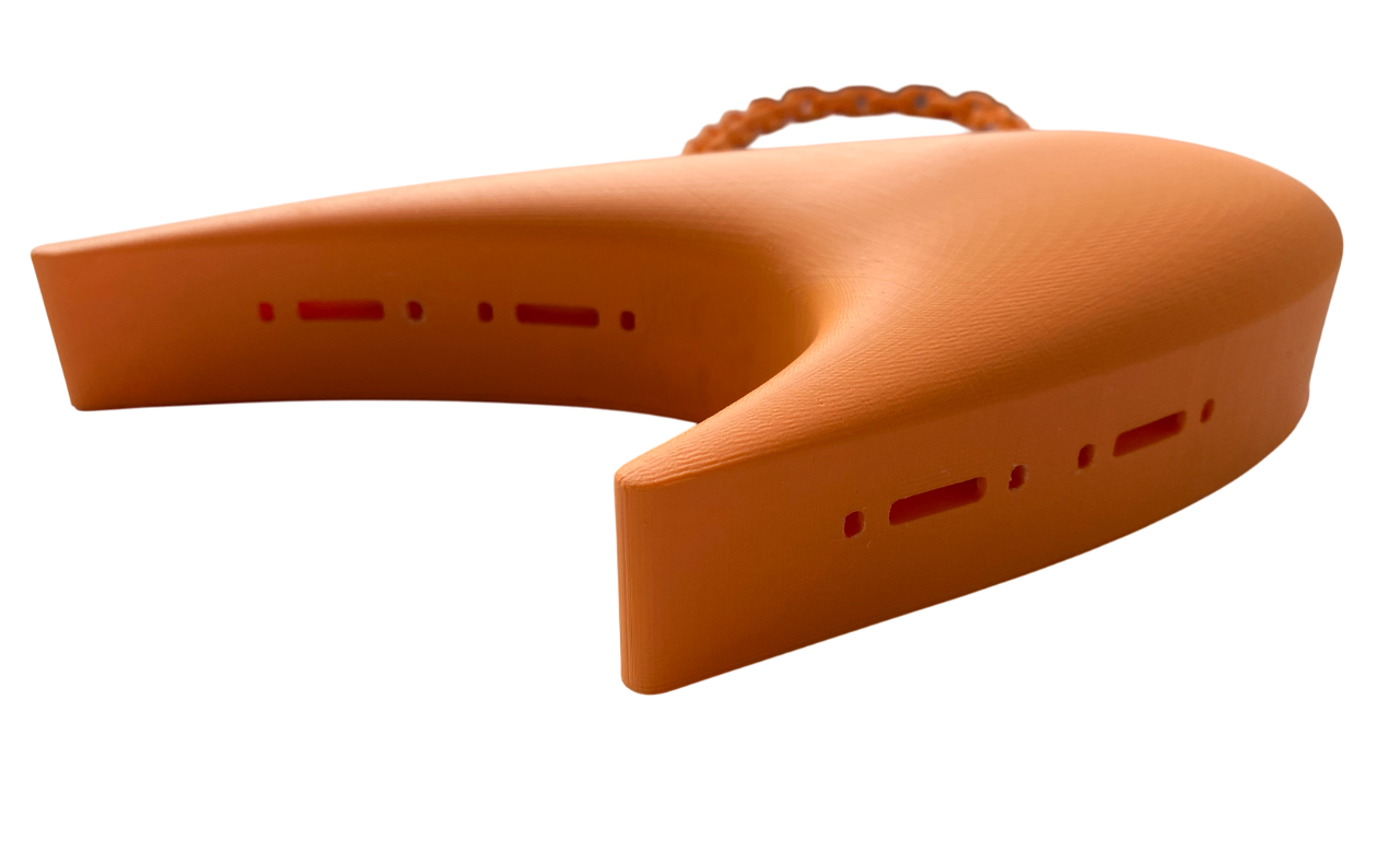 The Papaya Purse, conceptualized in March 2025, is based on the logo of McLaren for the first in a series of F1-inspired purses. The speedmark, as well as the McLaren Technology Center building, are sleek and futuristic in design. Similar design language can be found in the Nike and Star Trek logos. The purse captures this essence with its proportions and smooth 3D-printed surface. The purse body and strap were made in various "livery" colors. It was also made in two different sizes (the Papaya Mini and the larger Papaya purse).
