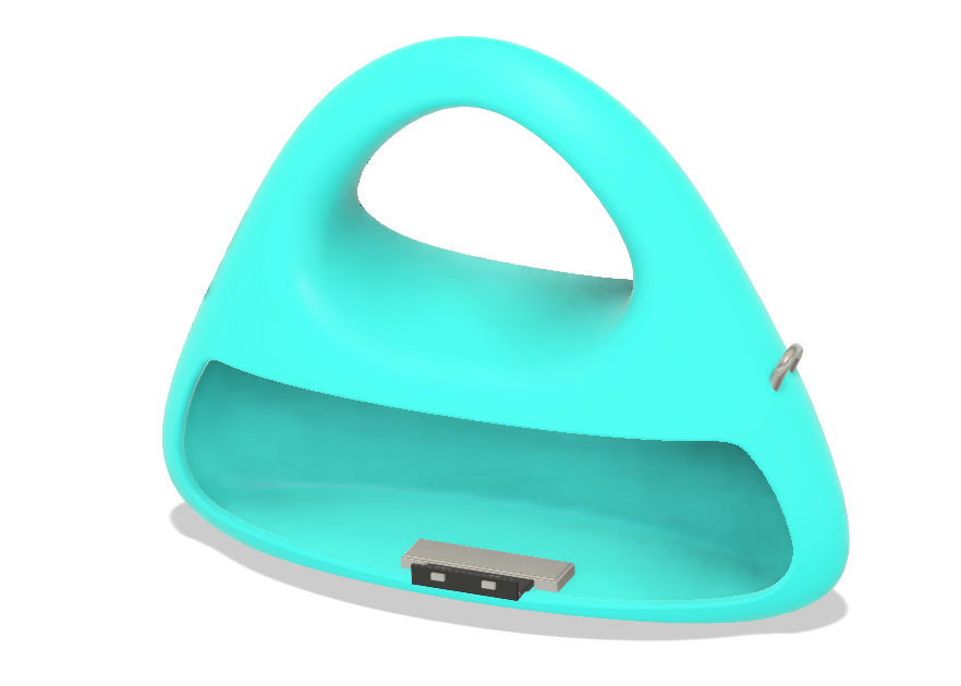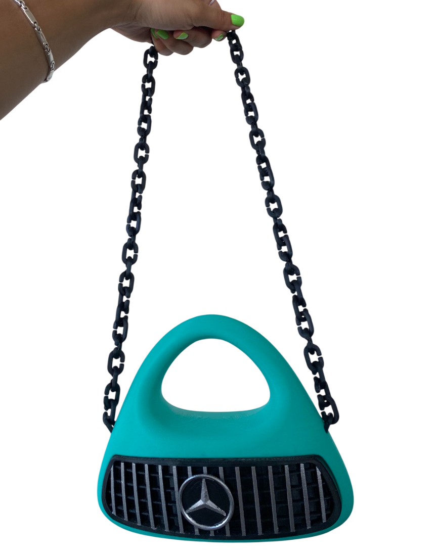The Car Grille Purse, conceptualized in March 2025, draws inspiration from the iconic front grille of a Mercedes. The grille opens up as the flap of the purse, and sports its signature silver arrows logo. Its color palette nods to the Petronas hues of the Mercedes F1 team. In tribute to Mercedes’ legacy of “German Engineering,” the purse integrates a mechanical spring-loaded latch, designed to compress as the logo rotates, activating the opening mechanism.